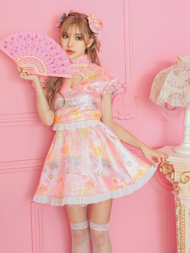 誰よりも華やかに映える!♪ [コスプレ] 花柄サテンタイトミニセクシーツインチャイナ服 [2点セット] (ワンピース/髪飾り)