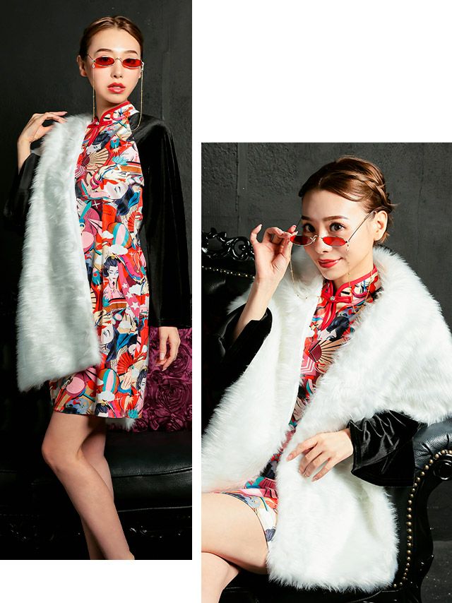 4. [コスプレ] マダム風ベルスリーブ体型カバー個性ベロアツインチャイナ服 [5点セット] (ワンピース/サングラス/グラスコード/安全ピン/ファーショール)