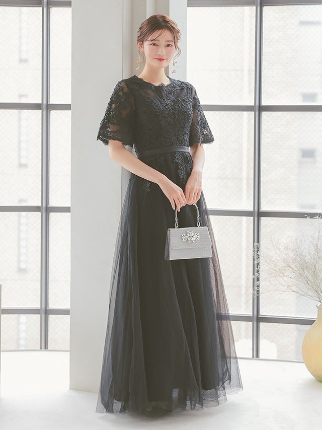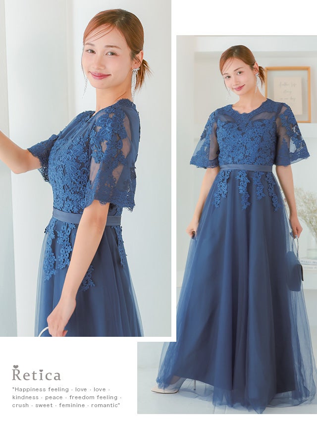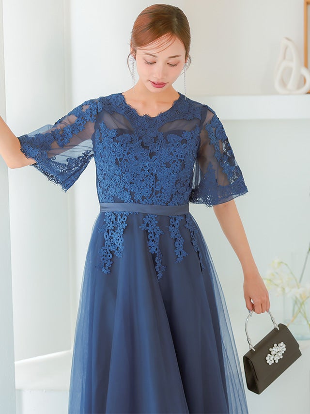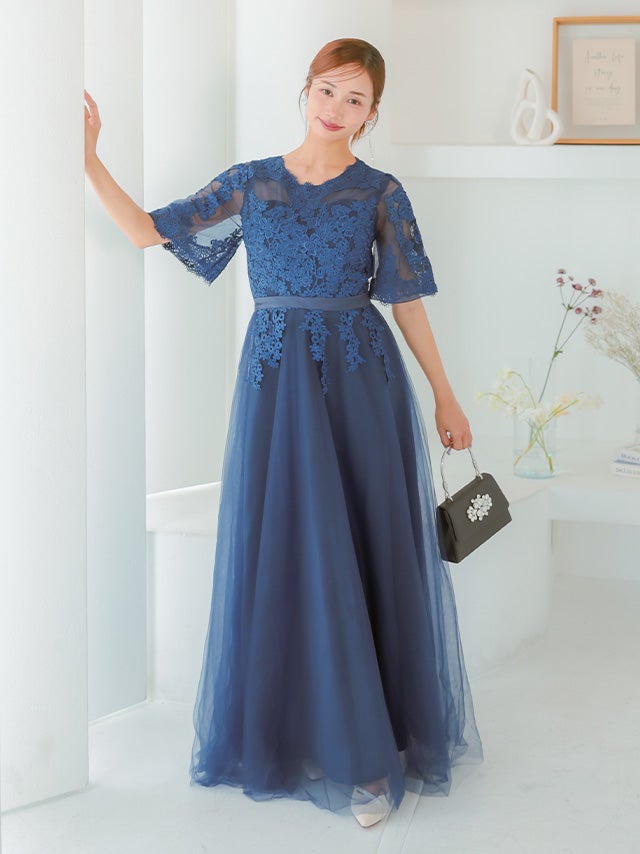 深みのあるネイビーカラーが上品な印象を引き立てるロングドレス。