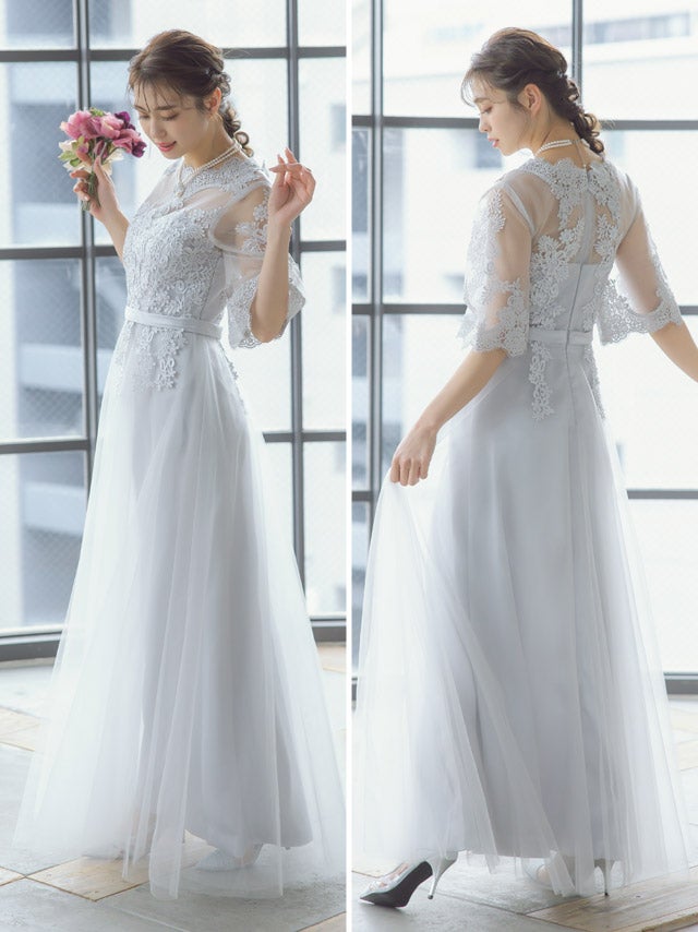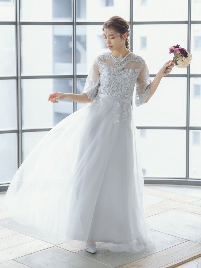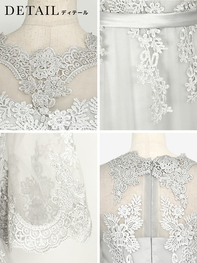デコルテから背中、袖にかけてはシースルーデザインを取り入れ程よい抜け感をプラス。