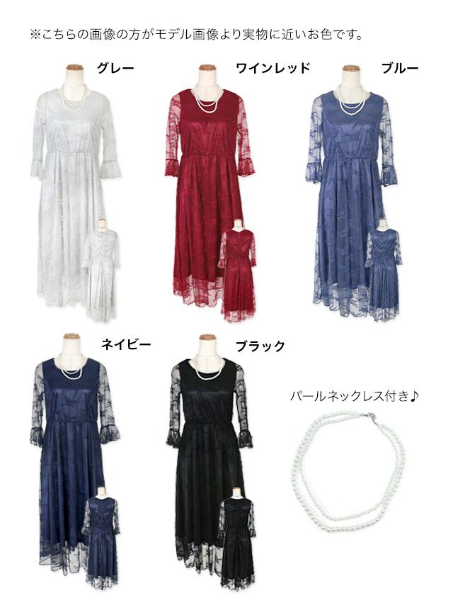 パールネックレス付きフラワー総レースAラインフレアミモレ丈ベルスリーブ結婚式パーティードレスのカラーバリエーション画像