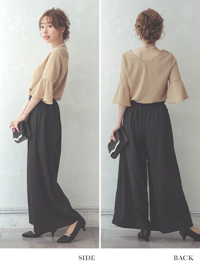 - [SALE] タックデザイン切り替えリングベルト付きワイドパンツツーピース五分袖ベルスリーブ結婚式パーティードレス [Retica/レティカ]