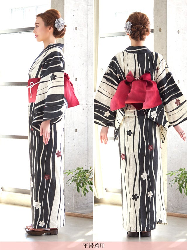 5. [浴衣] 椿柄 よろけ縞 古典レトロ モダン 黒白モノトーン 生成り地 2点セット 久保七瀬着用 [tk-yk2079-9fsk325]