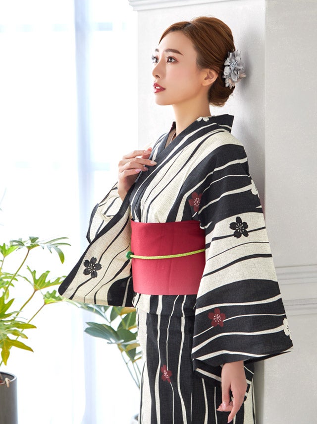 3. [浴衣] 椿柄 よろけ縞 古典レトロ モダン 黒白モノトーン 生成り地 2点セット 久保七瀬着用 [tk-yk2079-9fsk325]