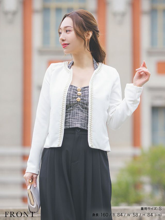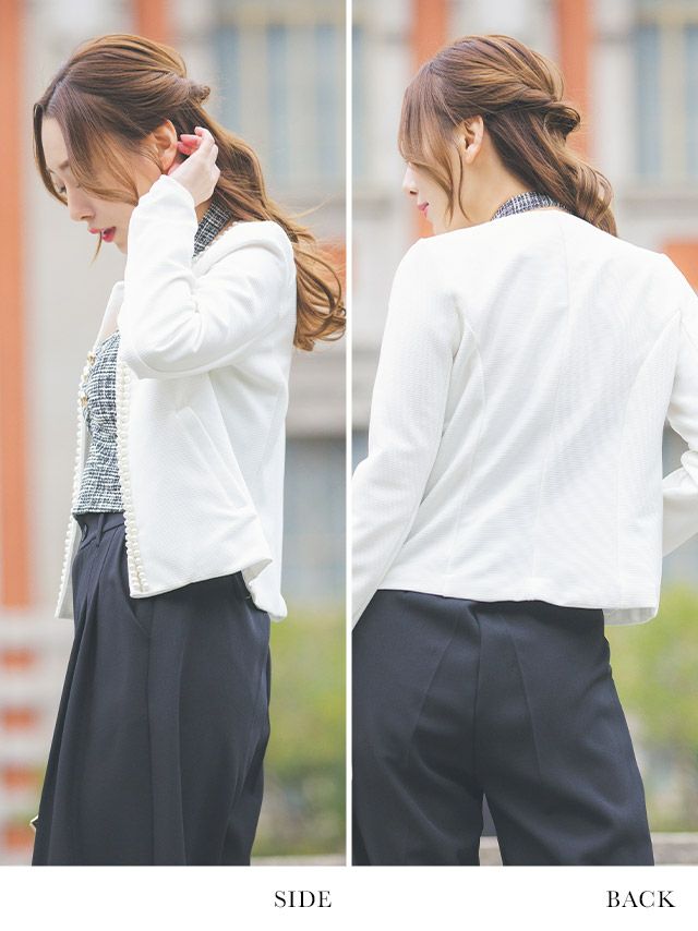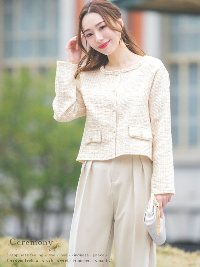 他の画像を見る 清楚な甘さとキレイめを演出♪ SALE ネックパールツイードノーカラージャケット×ワイドパンツスタイルセットアップセレモニースーツ [Retica/レティカ] ¥ 12,980 ¥ 6,490 税込 お気に入りに追加