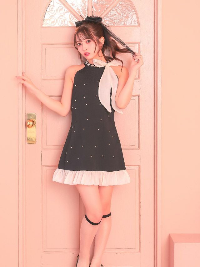 お顔周りを"ガーリー&可愛い"を格段にUP♡ ワンピース Aライン ミニドレス ノースリーブ 上品 ハイネック ネックリボン フラワービジュー パール 胸元カバー 裾フリル (黒嵜菜々子着用)
