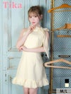 4. ワンピース Aライン ミニドレス ノースリーブ 上品 ハイネック ネックリボン フラワービジュー パール 胸元カバー 裾フリル (黒嵜菜々子着用)
