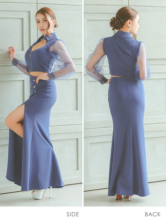 3. 襟付き シアースリーブ 袖あり 長袖 バストカット ジップ 谷間見せ ワンカラー ストレッチ セットアップ スリット タイトロングドレス (Sサイズ~XXLサイズ) (EGASARI/キャバドレス着用)
