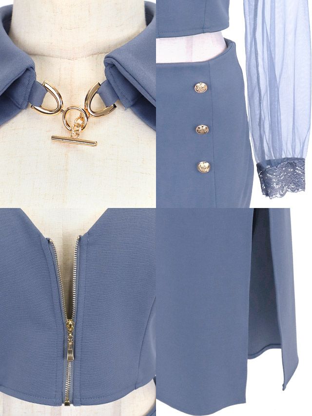 襟付き シアースリーブ 袖あり 長袖 バストカット ジップ 谷間見せ ワンカラー ストレッチ セットアップ スリット タイトロングドレスの商品特徴2