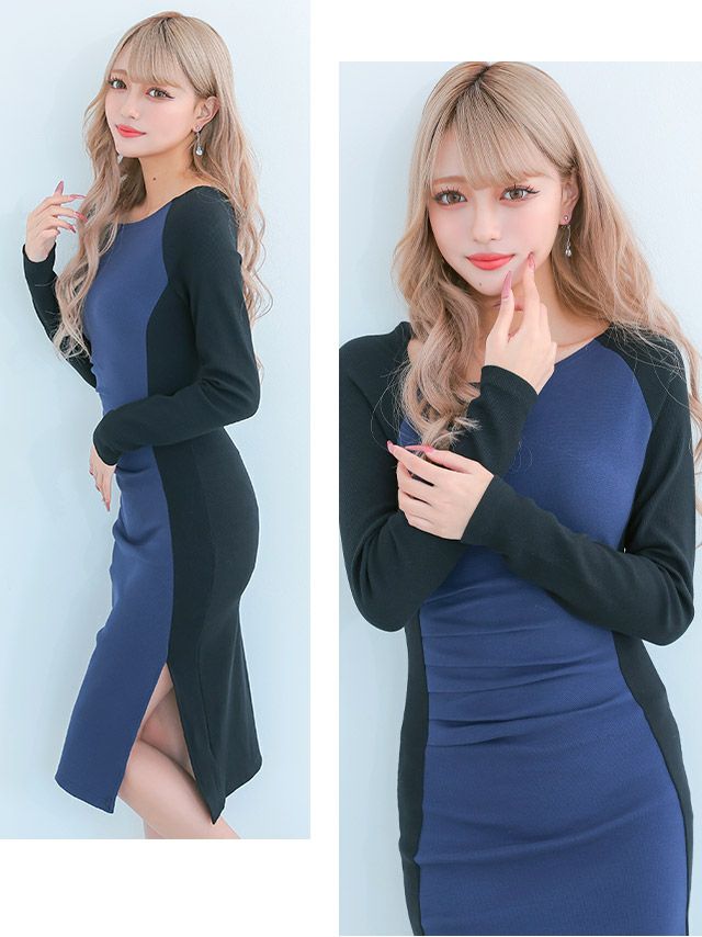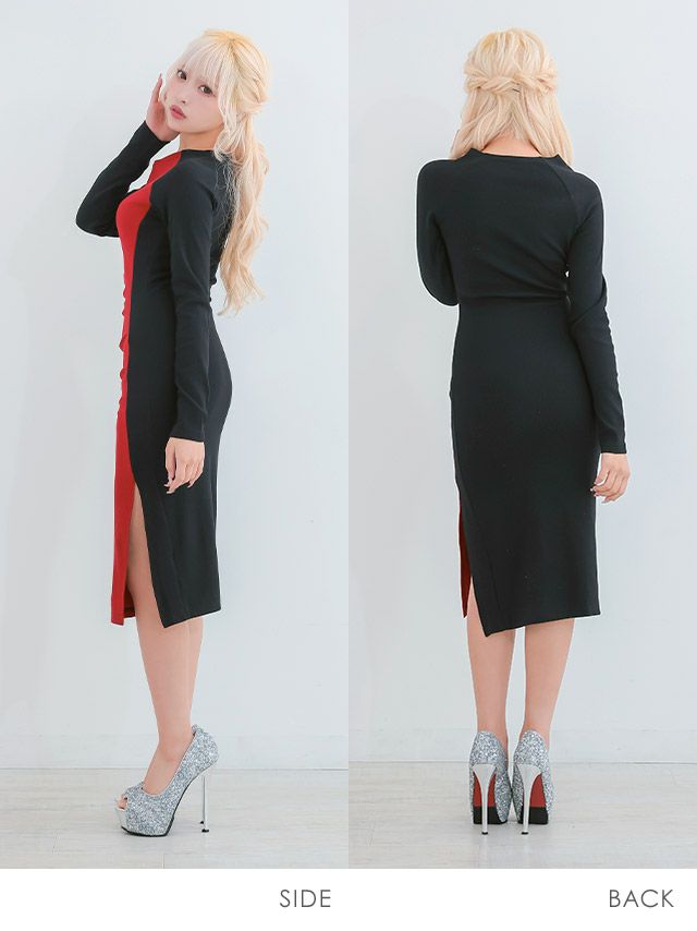 スレンダー魅せNo.1ドレス [ゲリラセール] バイカラー アシメトリーネック 長袖 袖ありタイト膝丈ドレス (林姫奈妙着用)