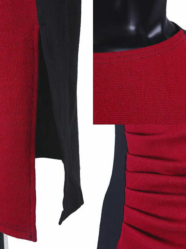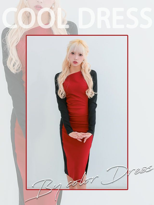 4. [ゲリラセール] バイカラー アシメトリーネック 長袖 袖ありタイト膝丈ドレス (林姫奈妙着用)