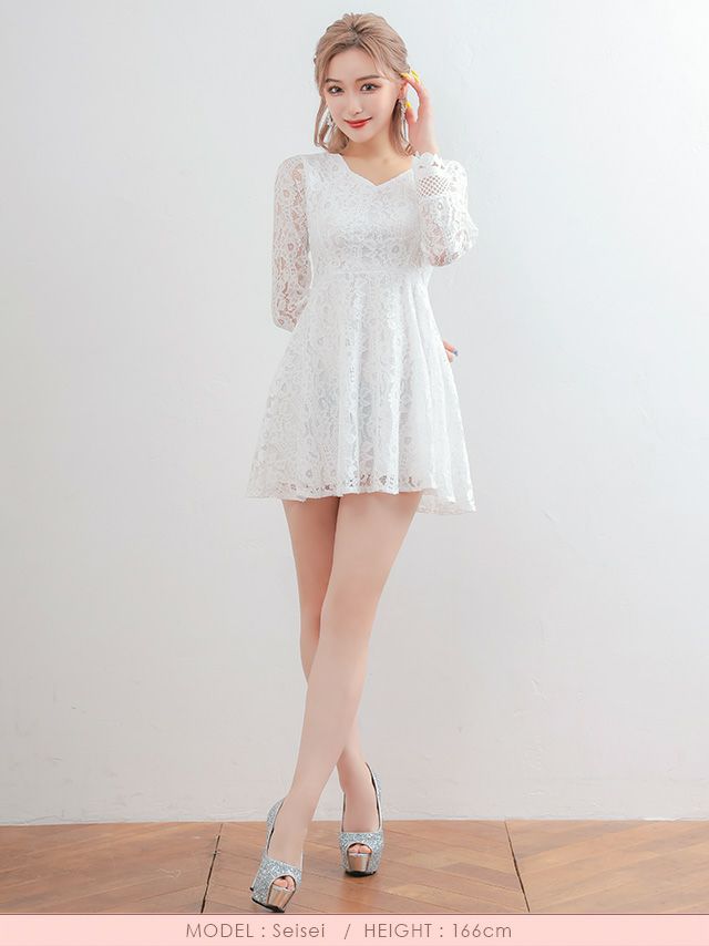 4. [ゲリラセール] 長袖 袖あり総レースデザインハイウエスト切替フレアミニドレス (向葵まる着用)