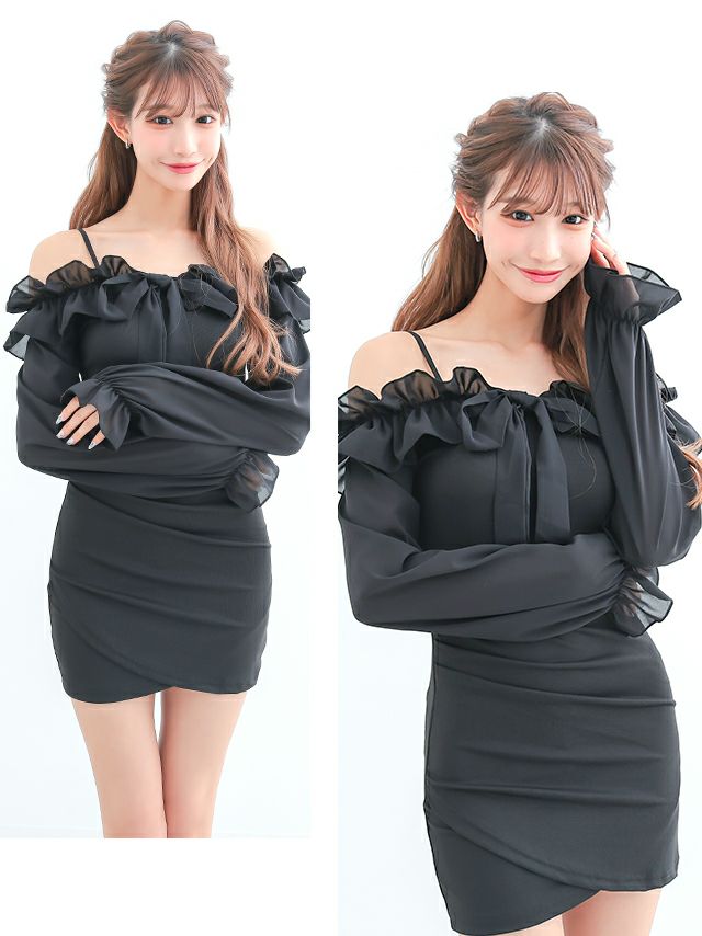 [ゲリラセール] 背中魅せ 胸元フリルワンカラー長袖 袖ありオフショルダータイトミニドレス (斉藤らな着用)