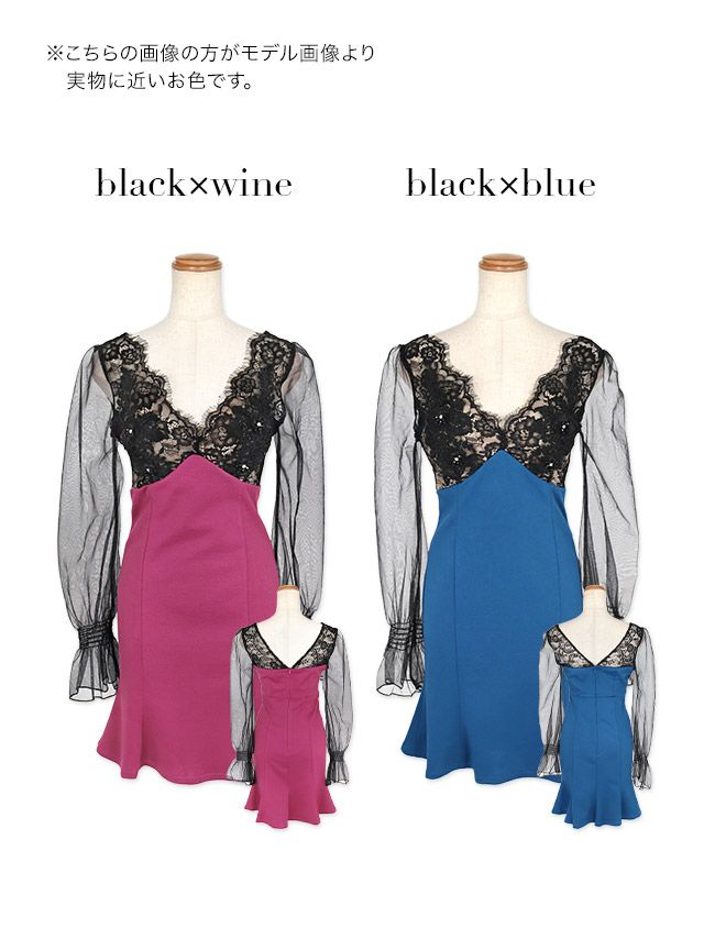 長袖シアーベルスリーブVネックスカラップレース切り替え裾フリルタイトミニドレスのカラーバリエーション