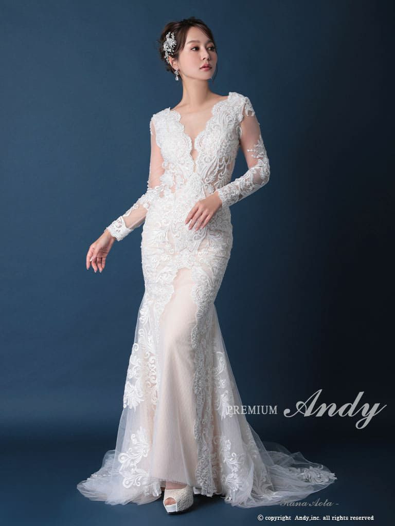 6. [PREMIUM Andy/プレミアムアンディ] 高級 バースデー 長袖 刺繍 レース バックカット マーメイド タイト ロングドレス