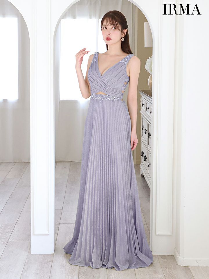 5. [IRMA/イルマ] 高級クロスノースリーブウエストカットビジュープリーツラメAラインロングドレス