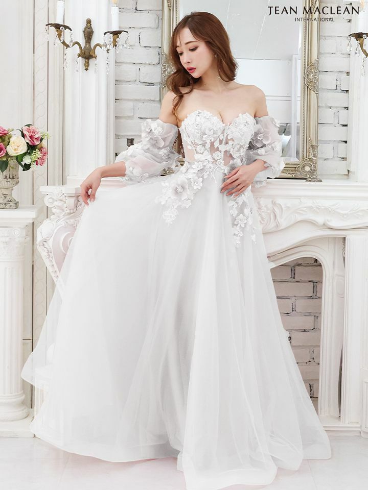 3. [JEANMACLEAN/ジャンマクレーン] 高級 バースデーパフスリーブ付きフラワーモチーフベアトップくびれ袖ありチュールフレアAラインロングドレス