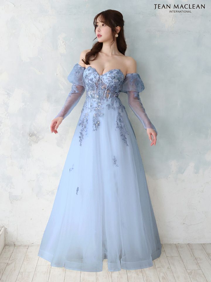 4. [JEANMACLEAN/ジャンマクレーン] 高級シアースリーブ付きフラワー刺繍ベアトップチュールAラインロングドレス