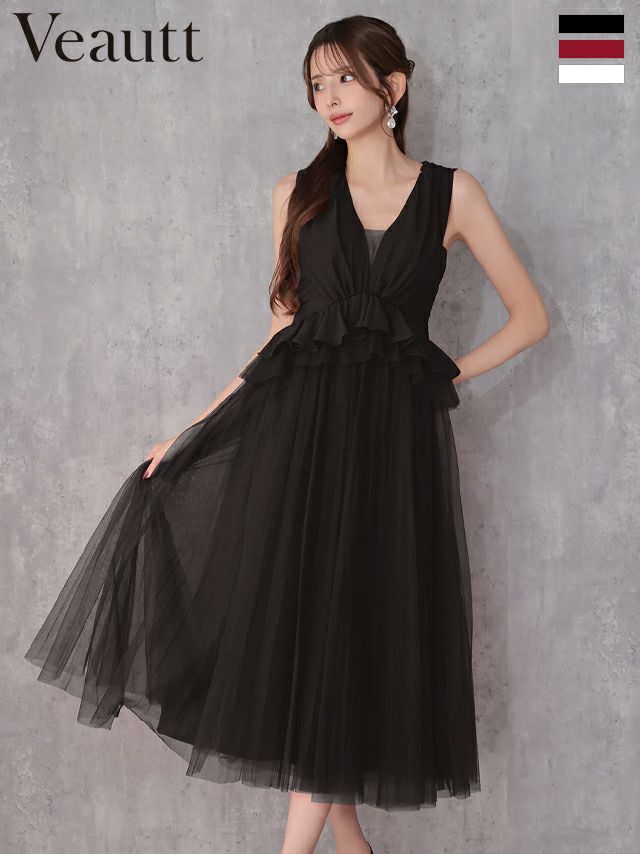ふんわりペプラムでメリハリをプラス♡ [Veautt/ヴュート] 高級 ブランド Aラインロングドレス 背中魅せ シンプル 大人 ノースリーブ 上品 ペプラム チュール