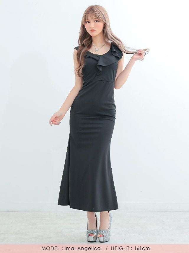 シンプルワンカラーノースリーブ胸元フリルマーメイドロングドレスのイメージ画像1