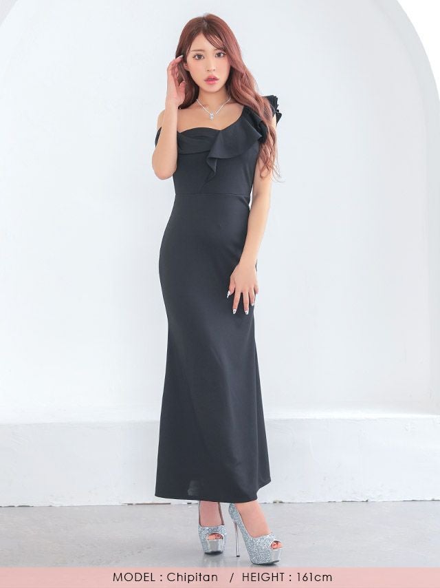 3. 背中魅せ シンプル ワンカラー ノースリーブ 胸元フリル マーメイド ロングドレス (ちぴたん着用)