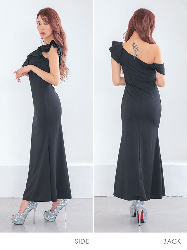 5. 背中魅せ シンプル ワンカラー ノースリーブ 胸元フリル マーメイド ロングドレス (ちぴたん着用)