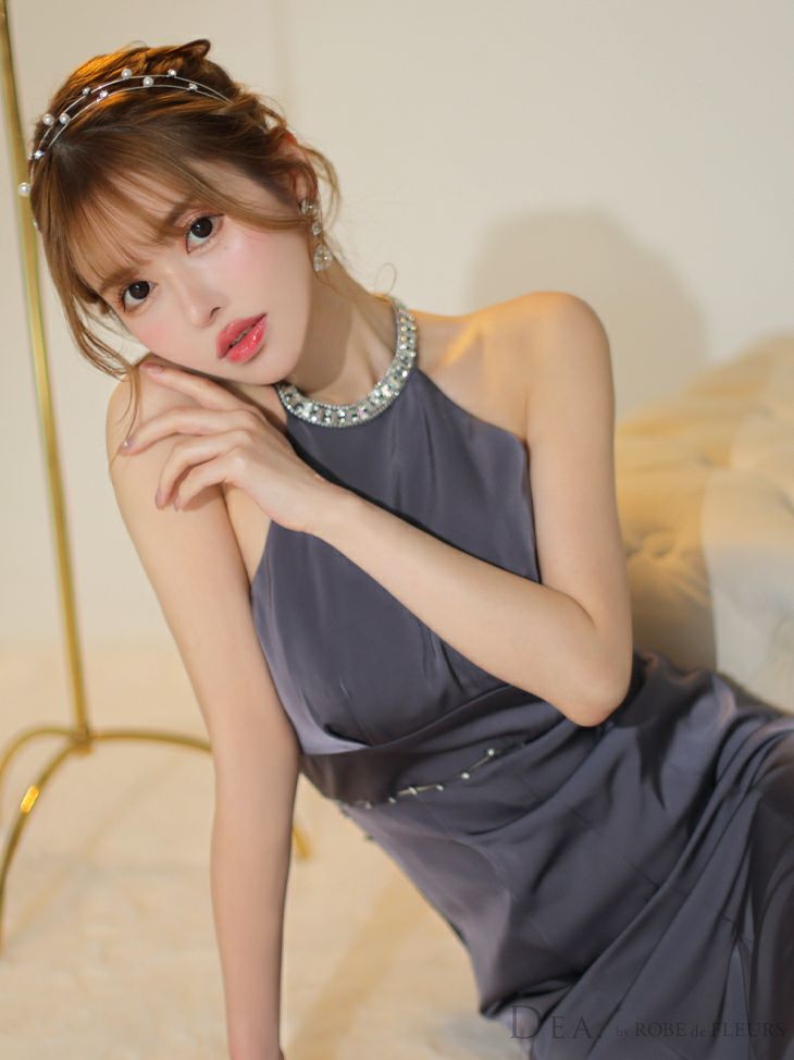 ホルターネックで華奢魅せデザイン☆ [DEA.byROBEdeFLEURS/ディアバイローブドフルール] 高級 ブランド ワンピース Aラインロングドレス 背中魅せ ホルターネック ウエストリボン ビジュー サテン