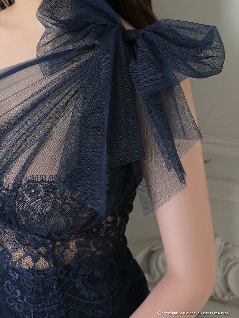 5. [an/アン] 高級ワンショルダーチュールレースリボンマーメイド膝丈ドレス