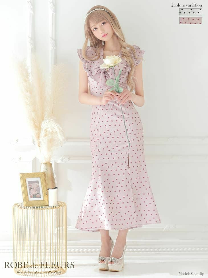 5. SALE [DEA.byROBEdeFLEURS/ディアバイローブドフルール] 高級フリル袖フロントリボンドット柄マーメイドノースリーブワンピースタイトロングドレス