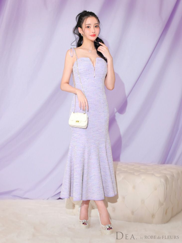 生地感で大人ガーリーに☆ [DEA.byROBEdeFLEURS/ディアバイローブドフルール] 高級 リボン キャミソール フロントジップ ニットツイード マーメイド 膝丈ドレス