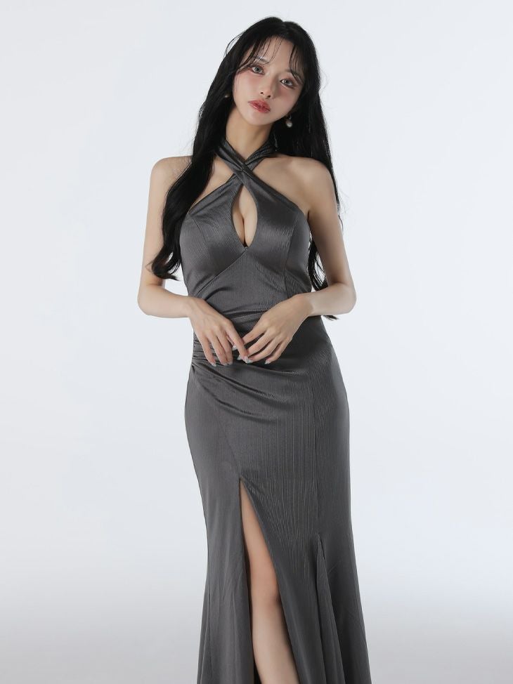 4. ホルターネックの高級ロングドレス
