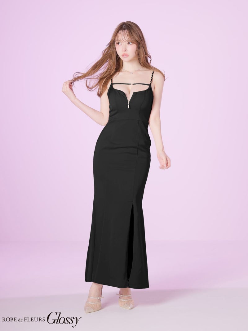 深めのスリットで色気をプラス♡ [ROBEdeFLEURSGlossy/ローブドフルールグロッシー] 高級 ブランド ロングドレス マーメイド 谷間 キャミソール チェーン ジップ バストコード 背中魅せ サテン スリット