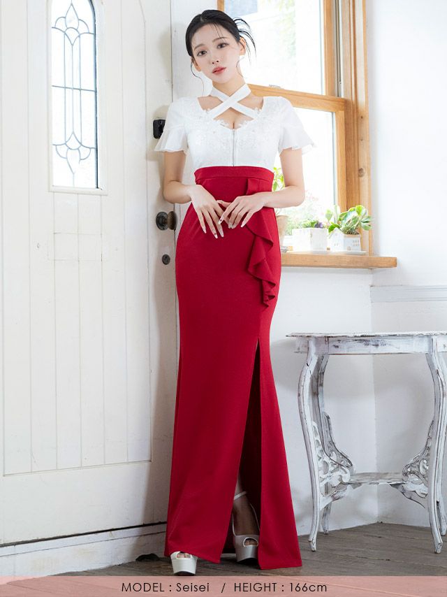 4. [SALE] クロスネック フラワーレース 半袖 バストジップ サイドフリル バイカラー タイトロングドレス (Sサイズ~XXXLサイズ) (せいせい/キャバドレス着用)