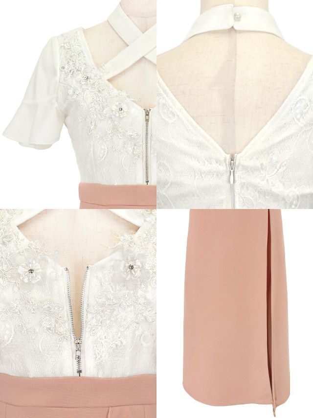半袖クロスネックフラワーレースバストジップ切り替えサイドフリルスリットバイカラータイトロングドレスのイメージ画像2