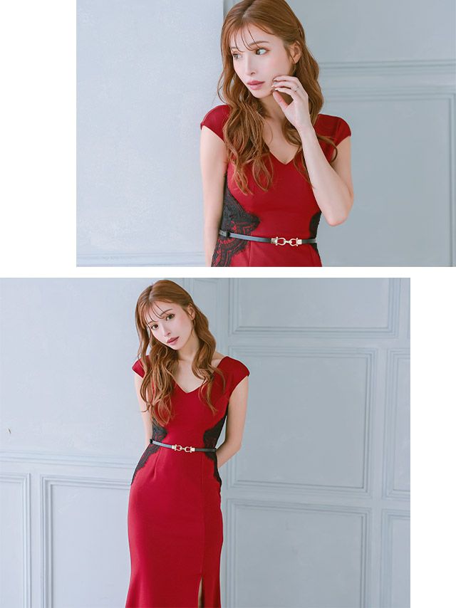 半袖Vネックウエストベルト付きくびれブラックレースデザインスリットストレッチクリスマスセクシータイトロングドレス のカラーバリエーション