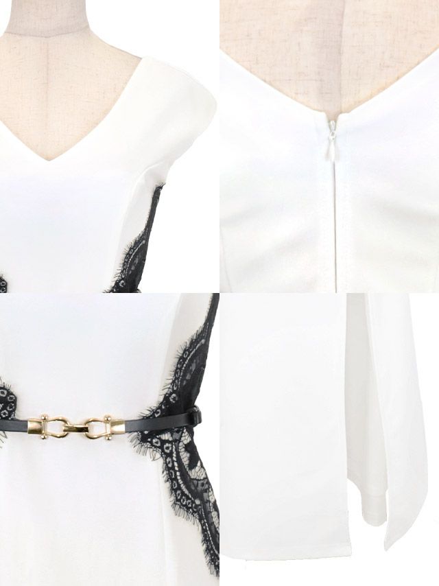 半袖Vネックウエストベルト付きくびれブラックレースデザインスリットストレッチクリスマスセクシータイトロングドレス のイメージ画像3