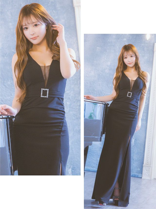 4. [SALE] ビジューバックルウエストベルト付きバストシアーノースリーブストレッチタイトロングドレス (Sサイズ~XLサイズ) (せいせい/キャバドレス着用)