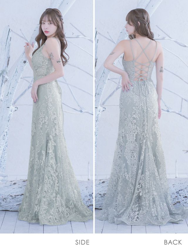 バストシースルースパンコール刺繍ラメクリスクロスバックレスキャミソールマーメイドロングバースデードレスのサイドバッグ全身