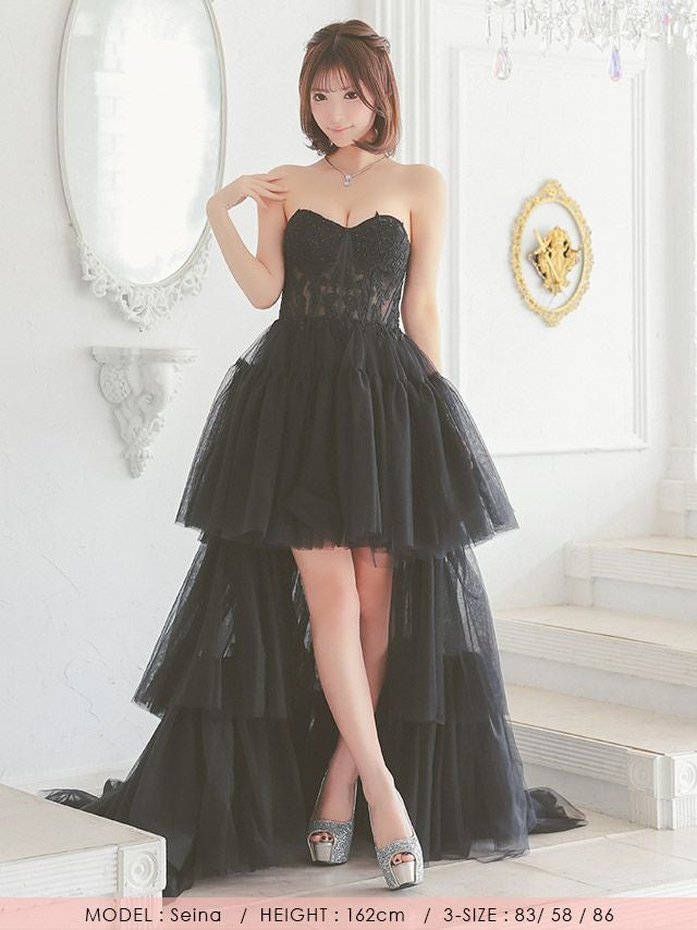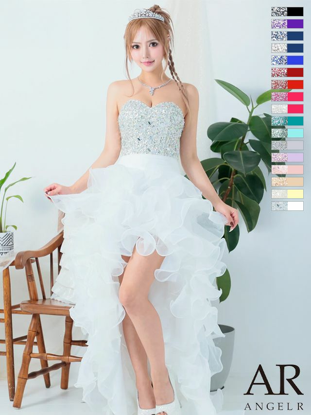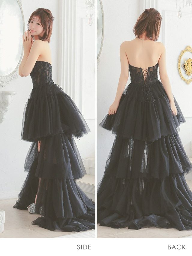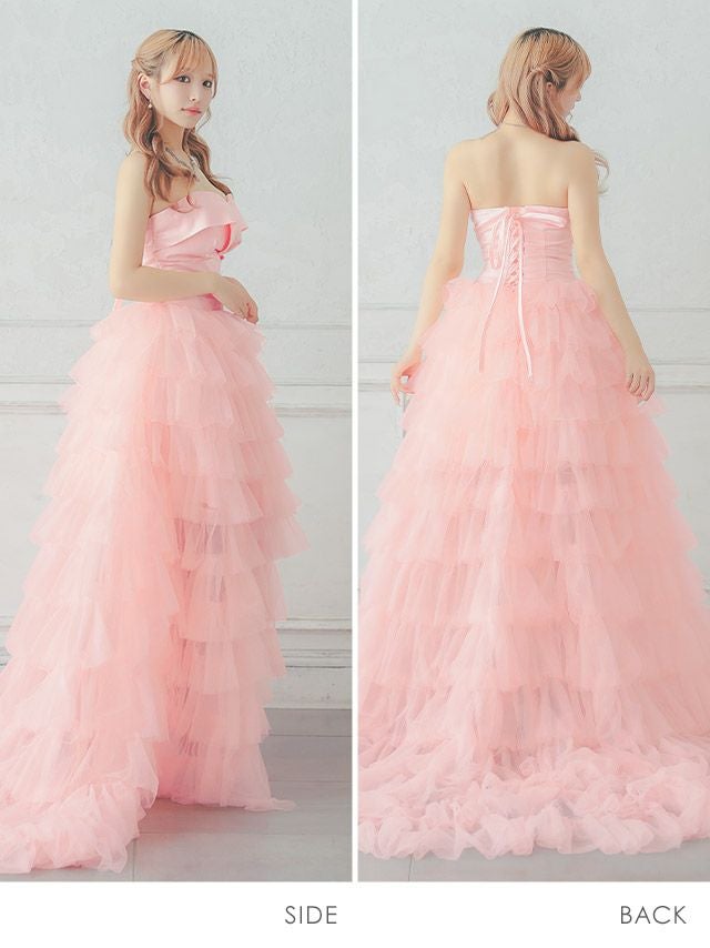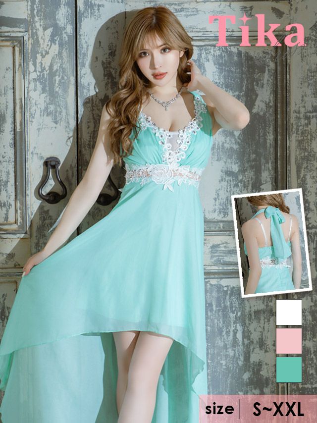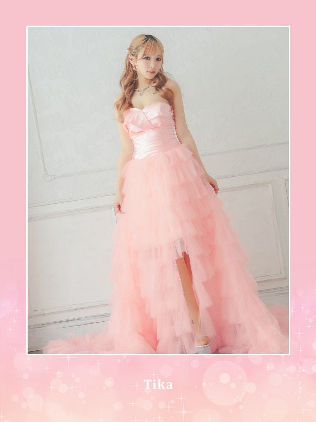 前から見るとミニ丈で後ろはロング丈(もしくは前身より長くなっている)のデザインのドレスのことです♪美脚効果もありふわふわのスカートで華やかさ&体型カバーも抜群!前ミニやハイアンドロー、フィッシュテール、インナーミニロング、マレットドレスなど様々な呼ばれ方があり、定着している名前がないのでTikaでは前が短くて後ろが長いドレスのことをロングテールドレスと呼んでいます。