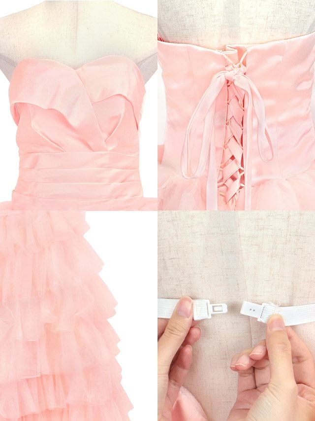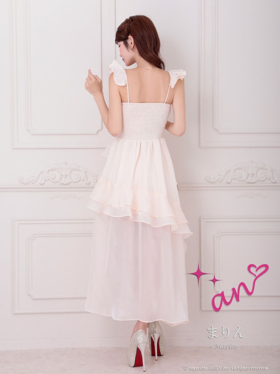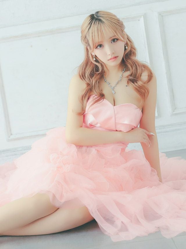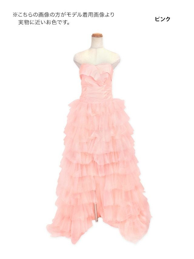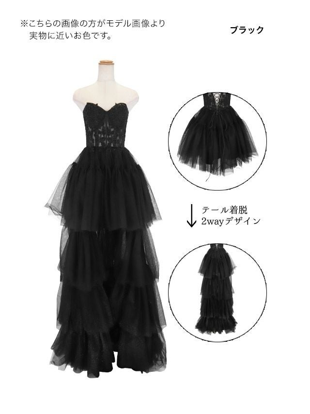前から見るとミニ丈で後ろはロング丈(もしくは前身より長くなっている)のデザインのドレスのことです♪美脚効果もありふわふわのスカートで華やかさ&体型カバーも抜群!前ミニやハイアンドロー、フィッシュテール、インナーミニロング、マレットドレスなど様々な呼ばれ方があり、定着している名前がないのでTikaでは前が短くて後ろが長いドレスのことをロングテールドレスと呼んでいます。