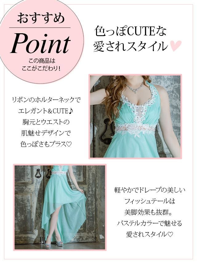 ロングテールドレスは上品に見せたい時や、雰囲気を落ち着かせたい時におすすめです。 キャバクラにはもちろん、ラウンジ、パーティー、同伴、など様々な場面でご着用頂ける万能さが魅力。 少しの丈の違いで雰囲気が変わるので一着は持っておくべきドレスです。