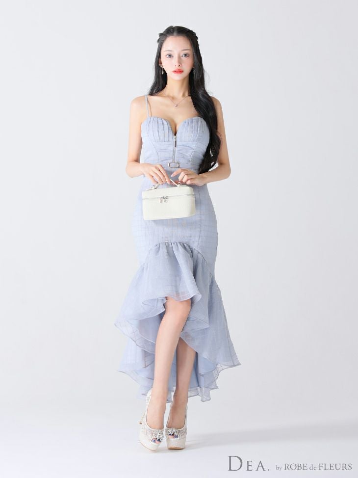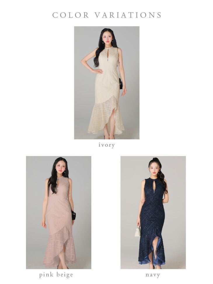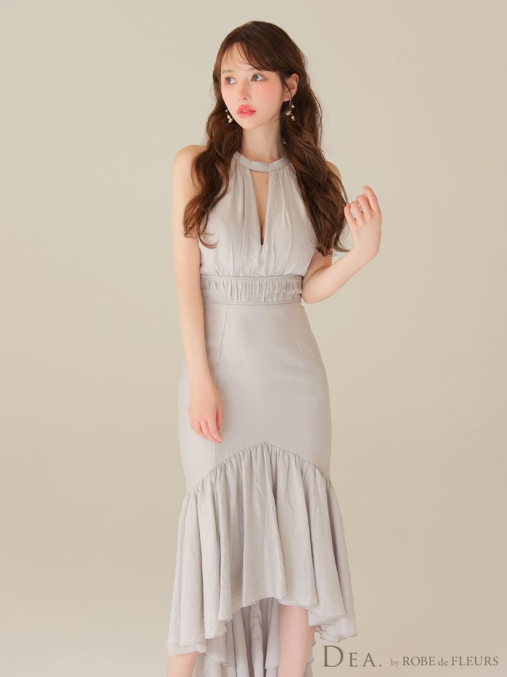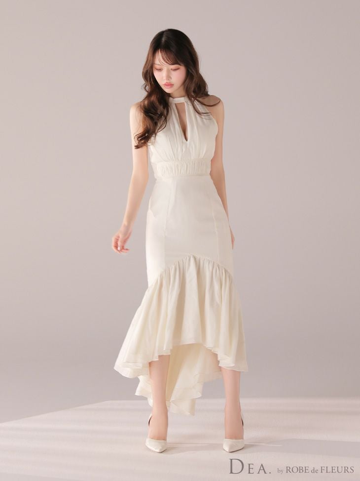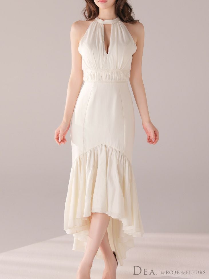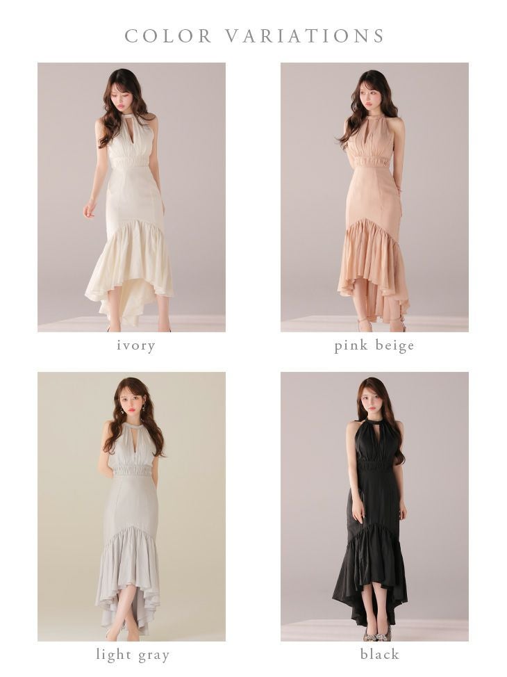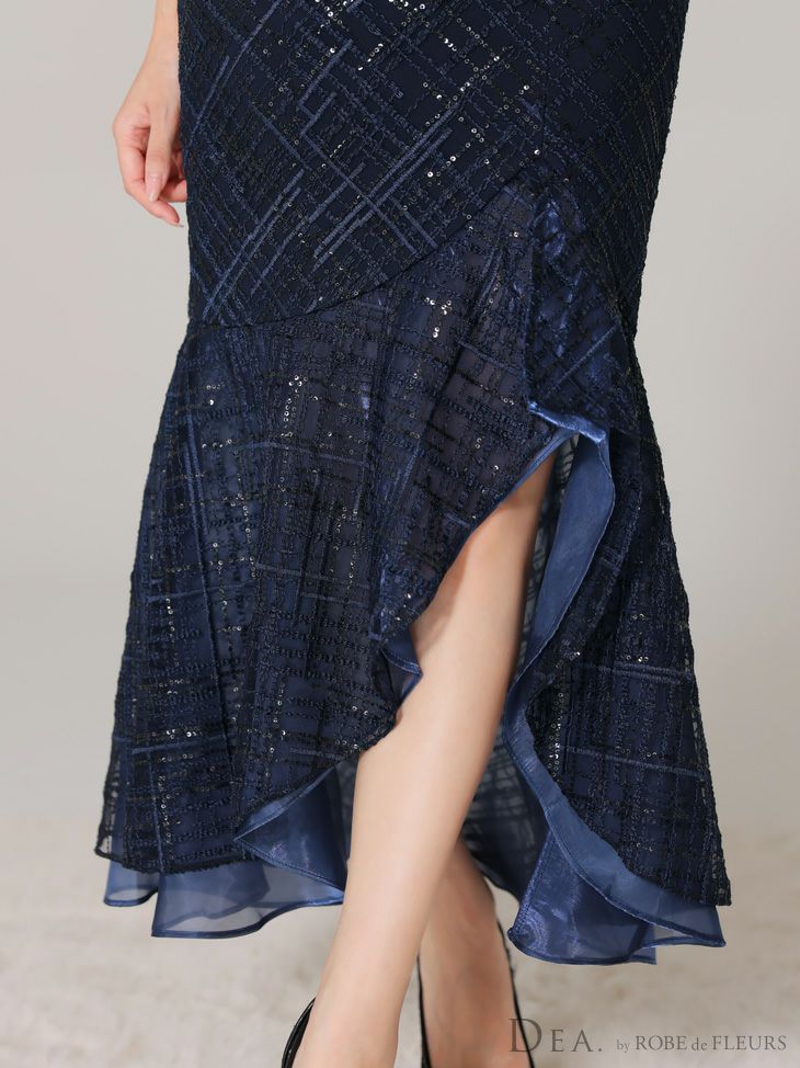 あなたのそんな願いを、フィッシュテール(ロングテール)という、フロントの裾よりもバックの裾の方が長く、魚の尾ビレのような揺らめきのシルエットをもつドレスが叶えてくれます♪ 動きに合わせて揺れるスカートがとてもドラマチックで、みんなの視線を集める事間違いなし◎ 体型カバー力も抜群なので、下半身の大きさや太さが気になる方にも是非着用して頂きたいデザインです。 足元が見えるので、あなたのこだわりのネイルを魅せたり、差し色になるカラーのものやデザイン性のあるものなどお気に入りのシューズを履いてもGOOD!