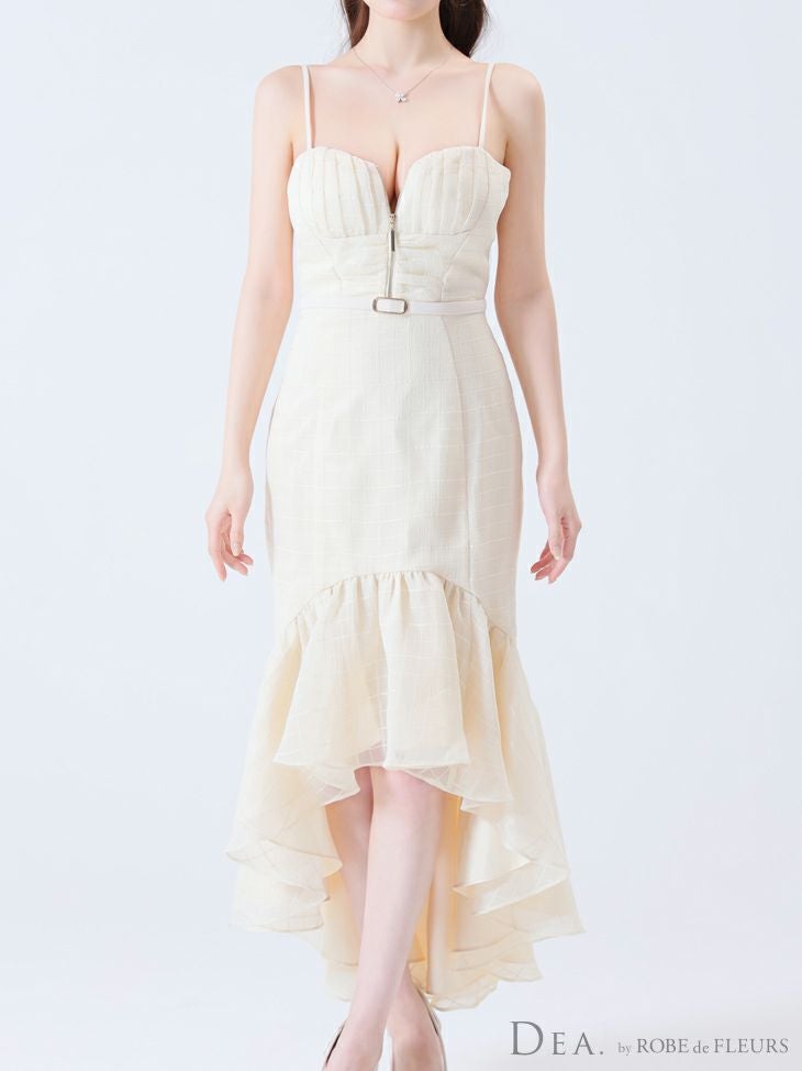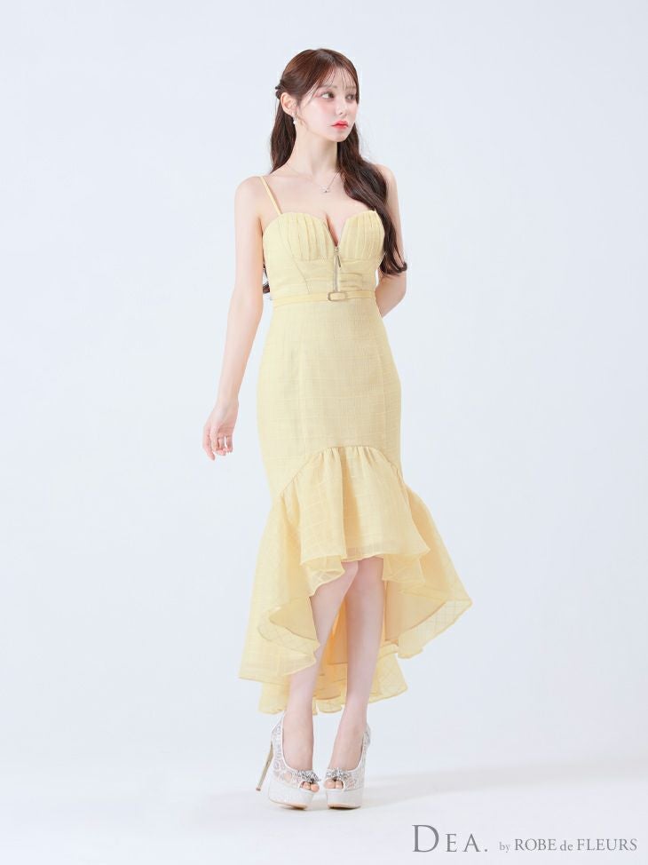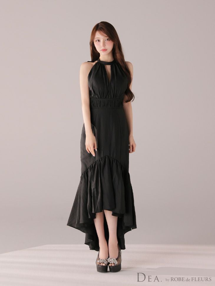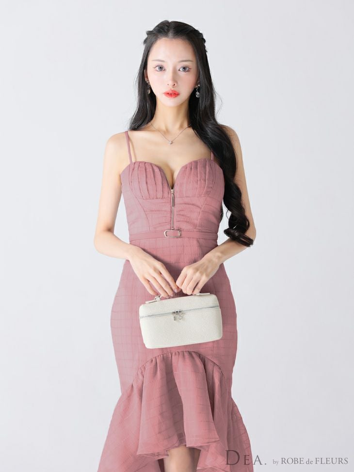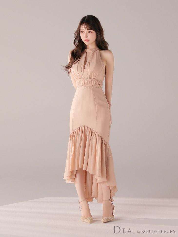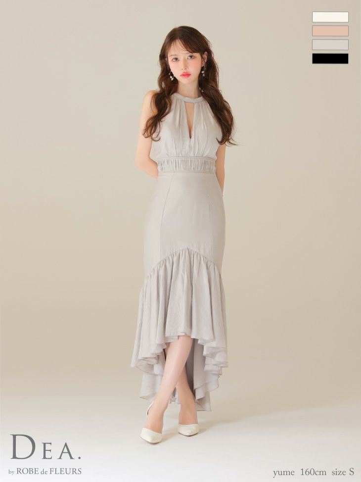 あなたのそんな願いを、フィッシュテール(ロングテール)という、フロントの裾よりもバックの裾の方が長く、魚の尾ビレのような揺らめきのシルエットをもつドレスが叶えてくれます♪ 動きに合わせて揺れるスカートがとてもドラマチックで、みんなの視線を集める事間違いなし◎ 体型カバー力も抜群なので、下半身の大きさや太さが気になる方にも是非着用して頂きたいデザインです。 足元が見えるので、あなたのこだわりのネイルを魅せたり、差し色になるカラーのものやデザイン性のあるものなどお気に入りのシューズを履いてもGOOD!