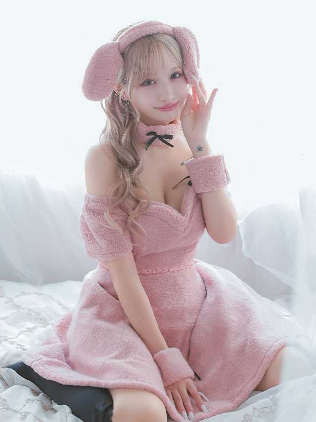 4. [SALE] コスプレ 犬 オフショル ウエストレース リボン 体型カバー フレアスカート ふわもこ ピンクプードル ガーリー ラブリー アニマル 4点セット (ワンピース/カチューシャ/チョーカー/カフス)