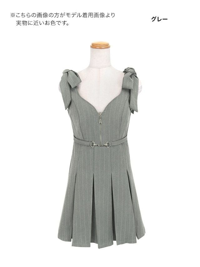 5. ミニドレス ワンピース Aライン ジップ プリーツスカート 谷間 ノースリーブ リボンショルダー ストライプ グレー XL キャバドレス (重川茉弥着用) [tk-md271305]