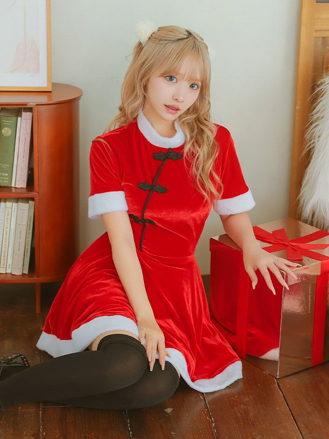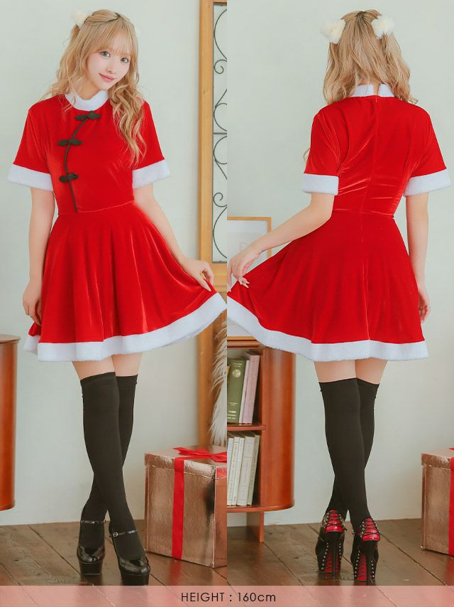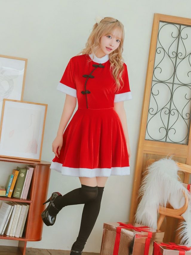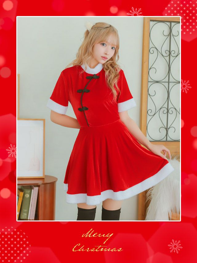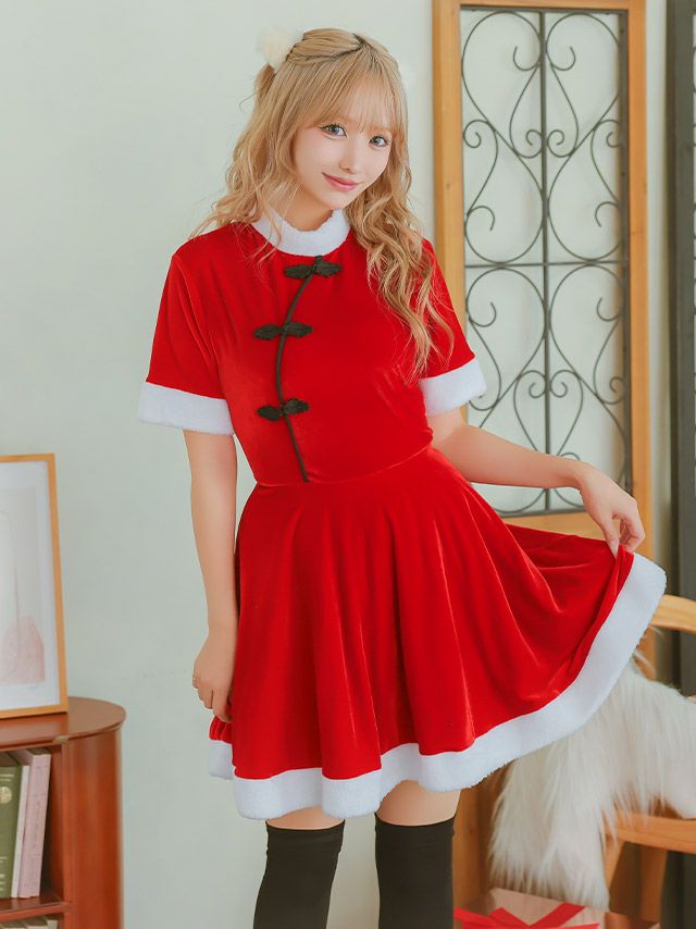 サンタコス 2点set チャイナデザインフレアスカートガーリー王道サンタツインコスプレイメージ画像4