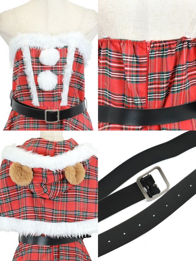 4. サンタコスプレ 4点set まやりん着用ケープ付きガーリータータンチェックテディベアフレアスカートアニマル [フード付きケープ+ワンピース+ベルト+透明ストラップ]
