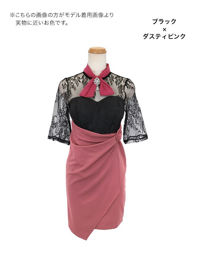 5. [SALE] ハイネックシアーフラワーリングベルトネックリボン袖ありブローチ付きタイトミニドレス (Sサイズ~XXLサイズ) (重川茉弥/キャバドレス着用)