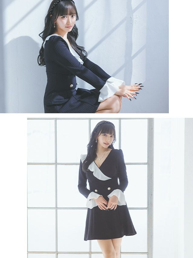 5. [韓国ドレス] 長袖 袖ありカシュクールアシメフリルダブルボタンモノトーンフレアミニドレス (Sサイズ~Lサイズ) (重川茉弥/キャバドレス着用)