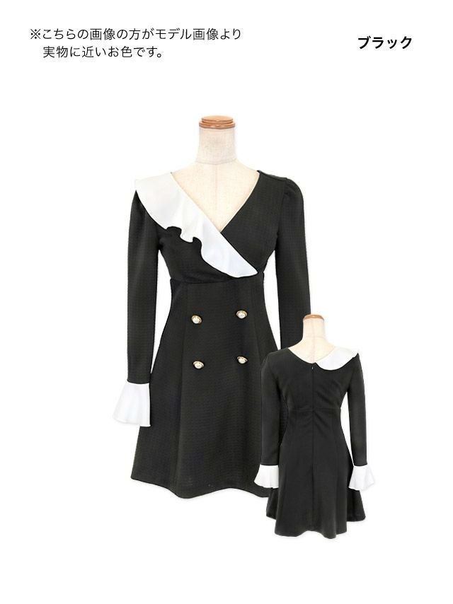 4. [韓国ドレス] 長袖 袖ありカシュクールアシメフリルダブルボタンモノトーンフレアミニドレス (Sサイズ~Lサイズ) (重川茉弥/キャバドレス着用)